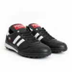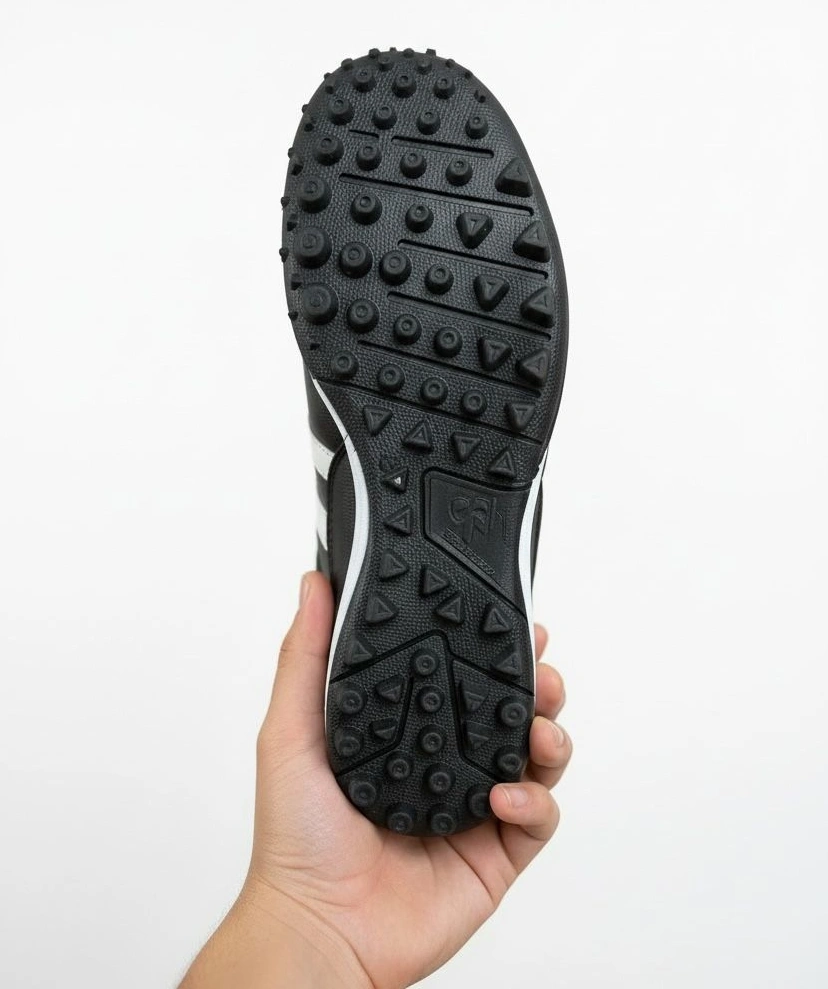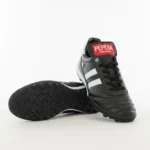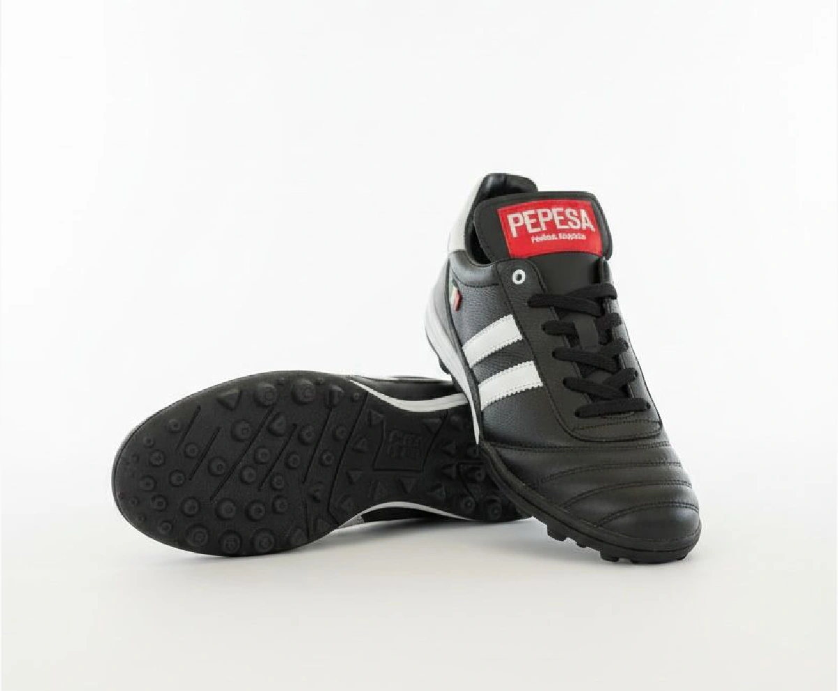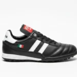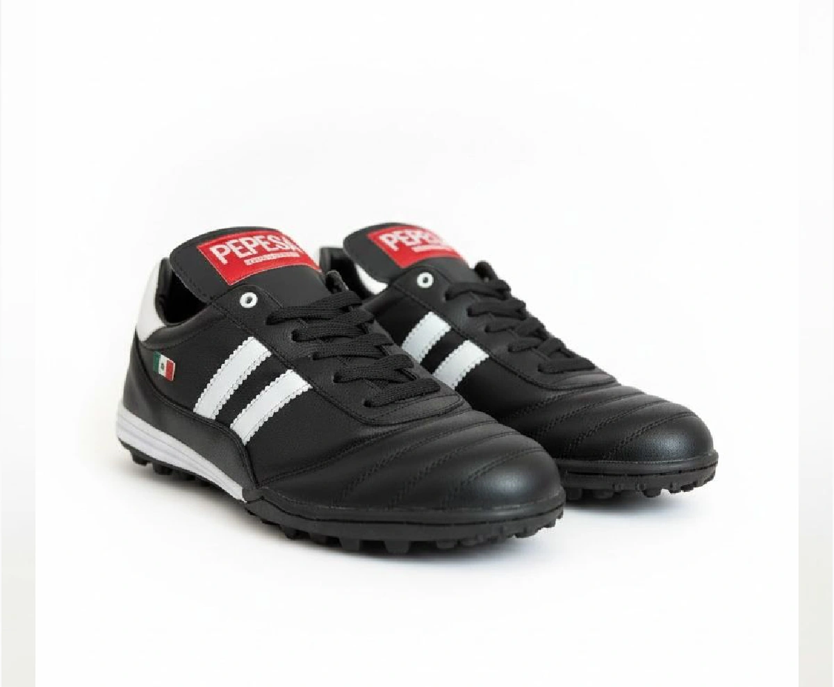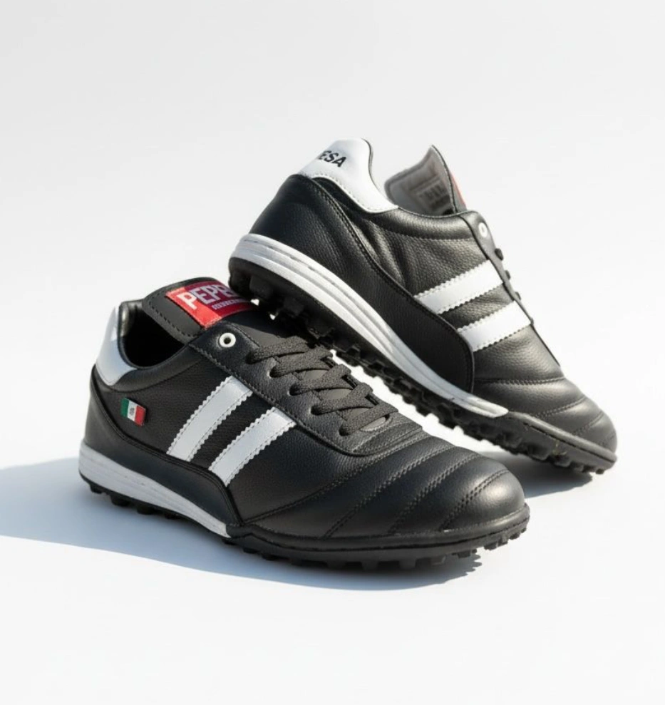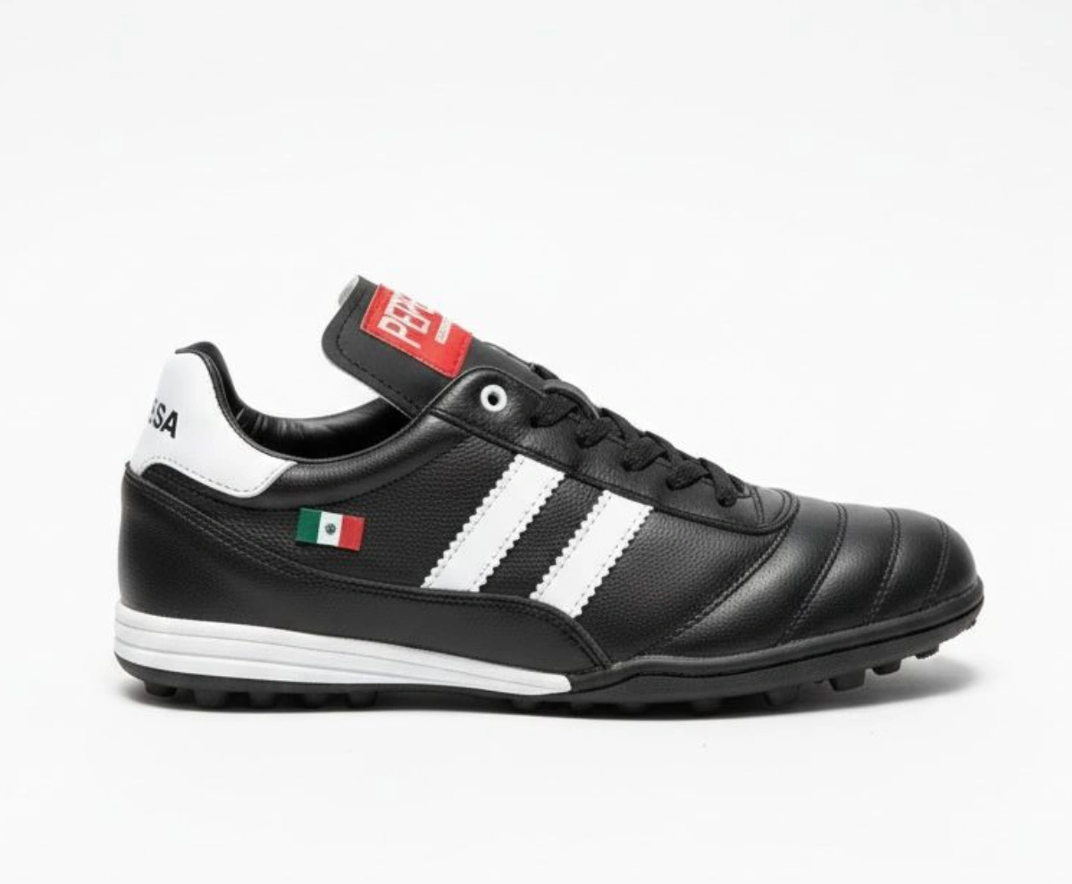 El modelo 965 negro es el tachón imprescindible para fútbol rápido y fútbol 7: piel auténtica que ofrece ajuste preciso desde el primer uso y suela que garantiza tracción constante en césped natural o sintético durante los partidos más exigentes.