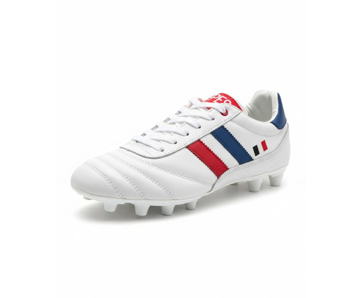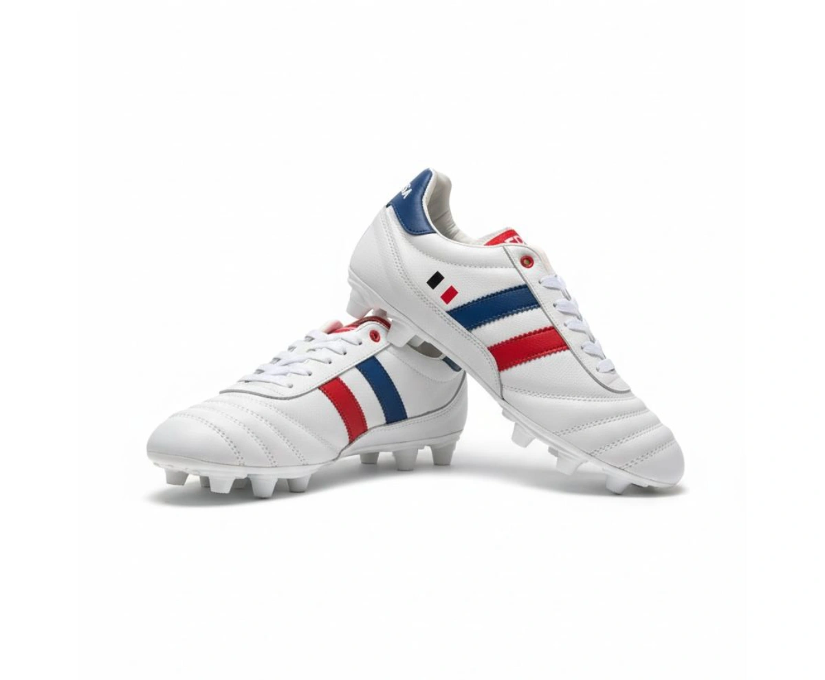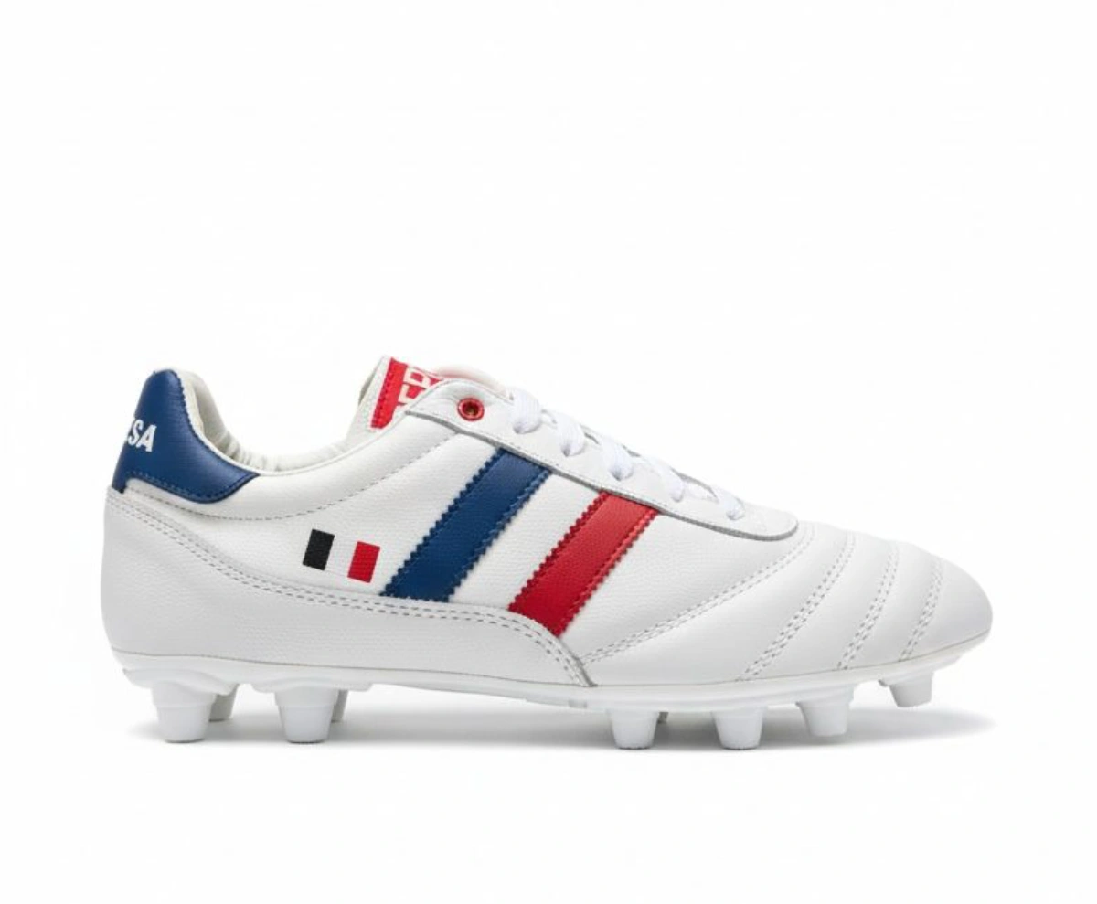 El modelo Francia es ideal para jugadores adultos de soccer en césped natural firme o artificial. Proporciona agarre óptimo con suela TPU en superficies mixtas, ofrece comodidad en partidos intensos y durabilidad contra desgaste.