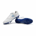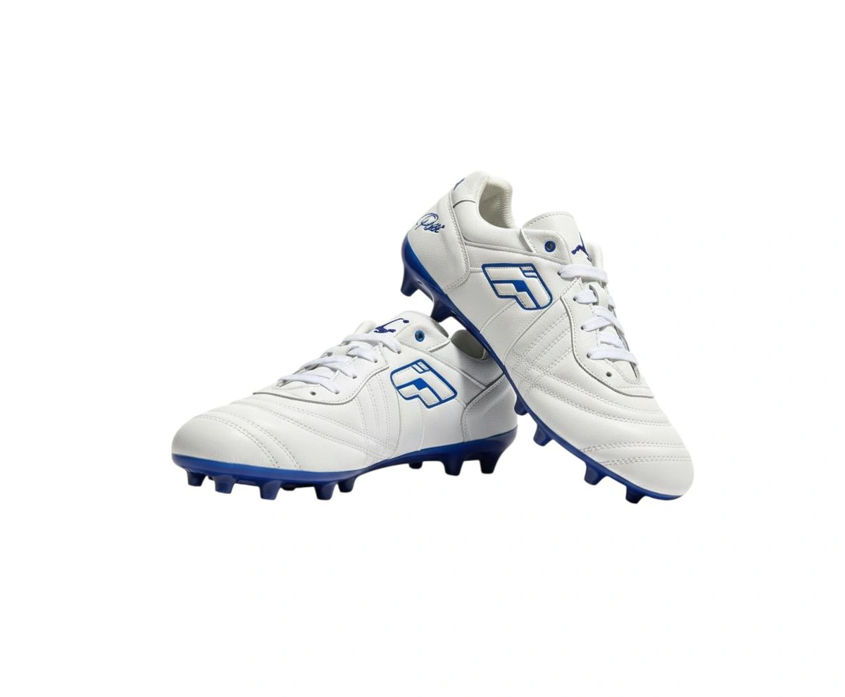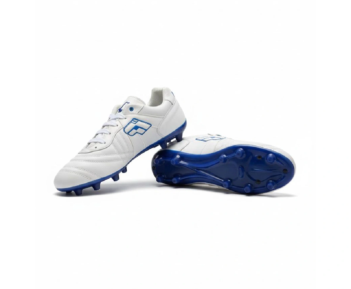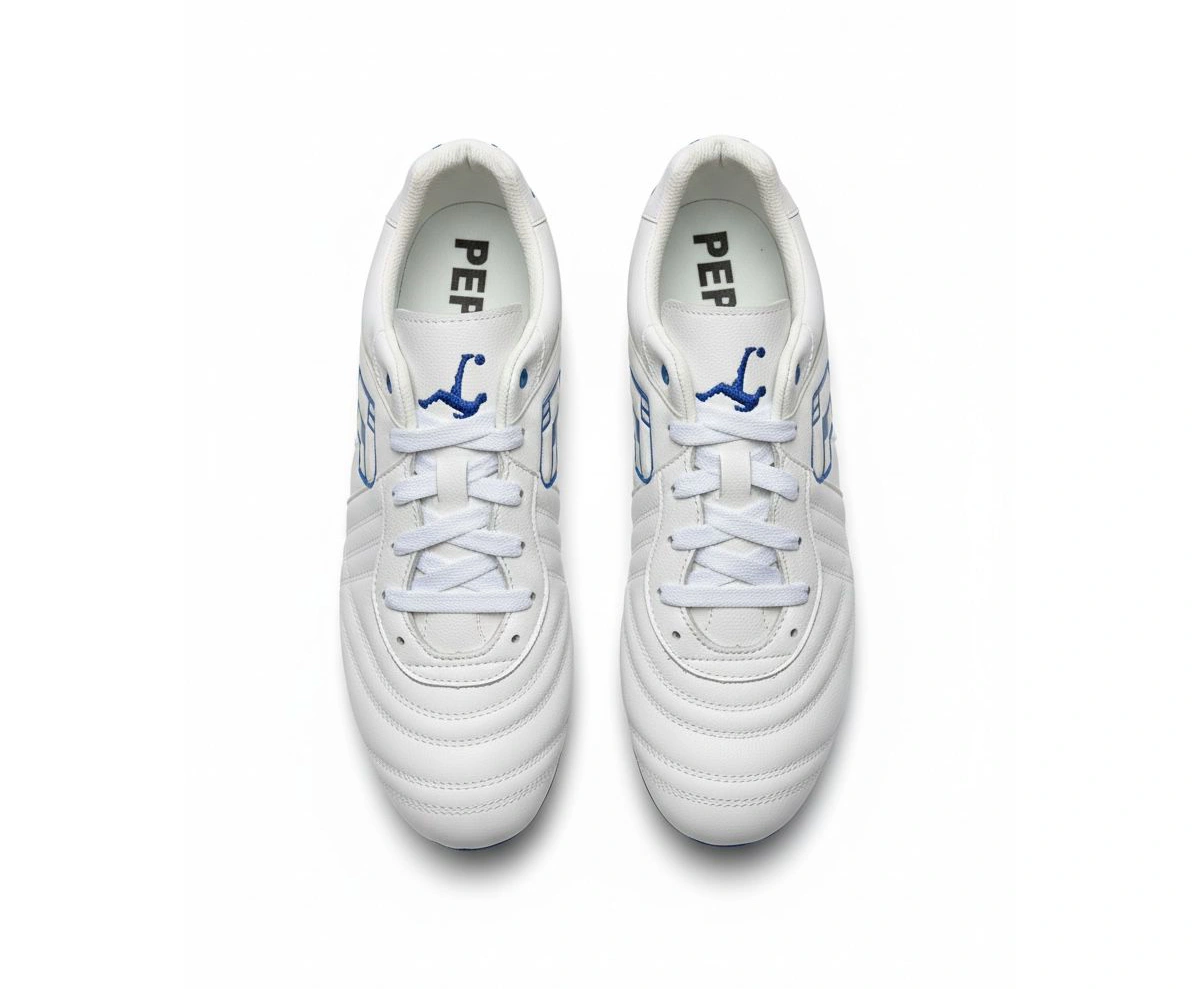 Diseñados para el estratega del equipo. La base en blanco puro proyecta limpieza en el juego, mientras que los acentos en azul profundo simbolizan la calma bajo presión. Estos tachones están construidos para ofrecer un toque de balón superior y una visibilidad impecable. Perfectos para el jugador que organiza el ataque y nunca pierde la concentración.